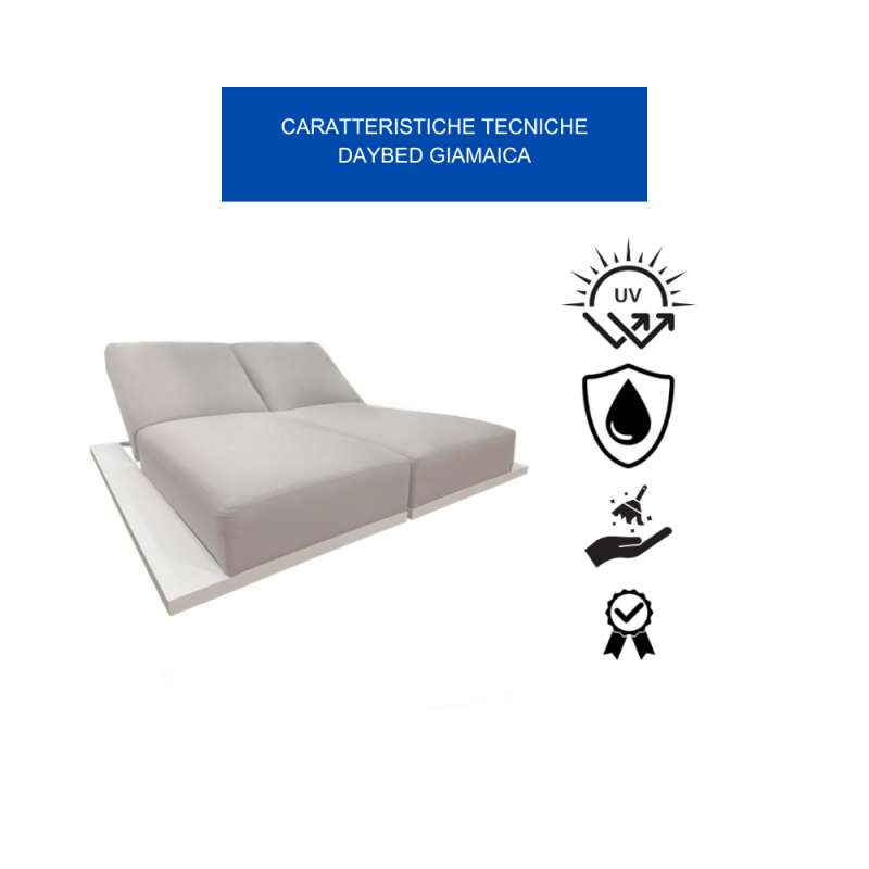 [RESISTENZA SENZA COMPROMESSI]: Realizzato Con Una Struttura In Alluminio Verniciato A Polvere Epossidica Bianca, Il Lettino Daybed Giamaica Klulk Si Erge Come Un Baluardo Contro Le Intemperie. La Sua Robustezza Lo Rende Un Alleato Affidabile Per L'Utilizzo In Ambienti Esterni, Sfidando Pioggia, Sole, Neve Con Stoica Resistenza. Potrai Goderti Il Tuo Relax All'Aperto Senza Timore, Anno Dopo Anno, Sicuro Che Il Tuo Lettino Klulk Rimarrà Intatto E Pronto Ad Accoglierti