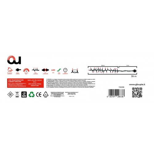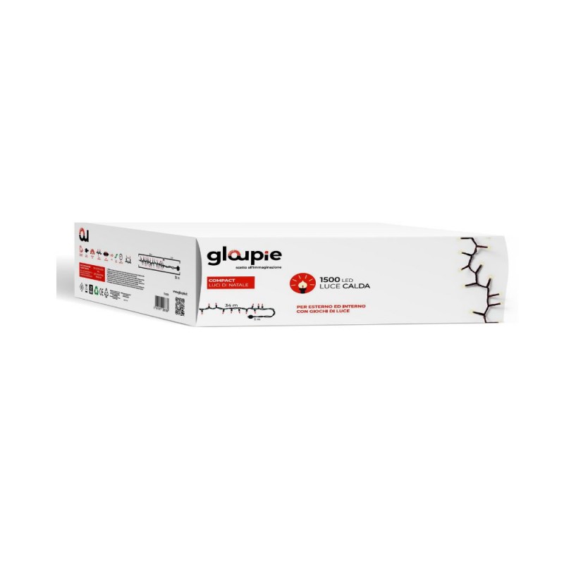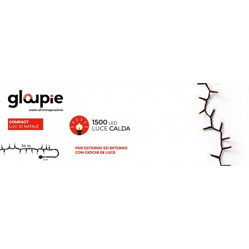 GLOUPIE Luci Di Natale Adatte Sia Ad Un Uso Esterno Che Interno Della Linea Compact 39 Metri (34 Metri Con Luci, 5 Di Solo Cavo Per Un Facile Collegamento Alla Presa Di Corrente Domestica), Con 1500 Led Dalla Colorazione Bianco Calda 31 V 22,5 W, Certificazione IP44, Cavo Verde Con Distanza Luci 2,2 Cm E Alimentazione Via Trasformatore A Bassa Tensione 220-240Vac 31Vdc 290MA 9 W, Funzione Memoria Timer 8 Ore On/16 Ore Off, 8 Giochi Luce [UN TOCCO DI MAGIA PER LE TUE FESTIVITA']: Avvolgi La Tua Casa In Un'Atmosfera Incantevole Con Le Luci Gloupie Compact. La Loro Calda Luce Dorata, Diffusa Da 1500 Led Suddivisi Su Di Un Cavo Verde Lungo 39 Metri (34 Metri Di Luci Con Distanza Fra Loro Di 2,2 Cm e 5 Metri Di Solo Cavo Per Un Migliore Collegamento Alla Presa Domestica), Creerà Un'Atmosfera Festosa E Accogliente. Ideali Sia Su Balconi, Facciate, O Qualsivoglia Spazio E Oggetto Interno O Esterno