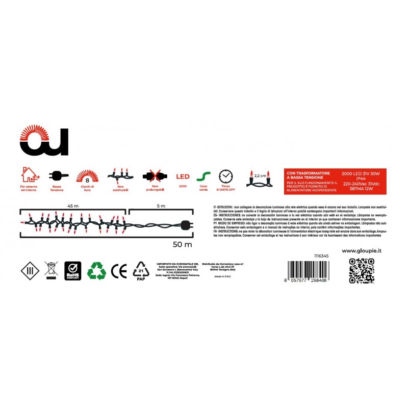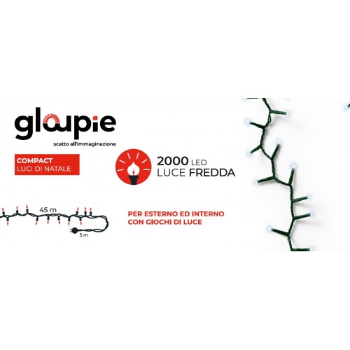 Avvolgi La Tua Casa In Un'Atmosfera Incantevole Con Le Luci Gloupie Compact. La Loro Fredda Luce Bianca, Diffusa Da 2000 Led Suddivisi Su Di Un Cavo Verde Lungo 50 Metri (45 Metri Di Luci Con Distanza Fra Loro Di 2,2 Cm e 5 Metri Di Solo Cavo Per Un Migliore Collegamento Alla Presa Domestica), Creerà Un'Atmosfera Festosa E Moderna. Ideali Sia Su Balconi, Facciate, O Qualsivoglia Spazio E Oggetto Interno O Esterno