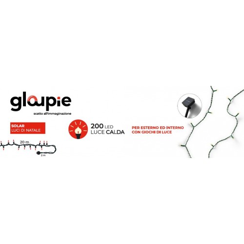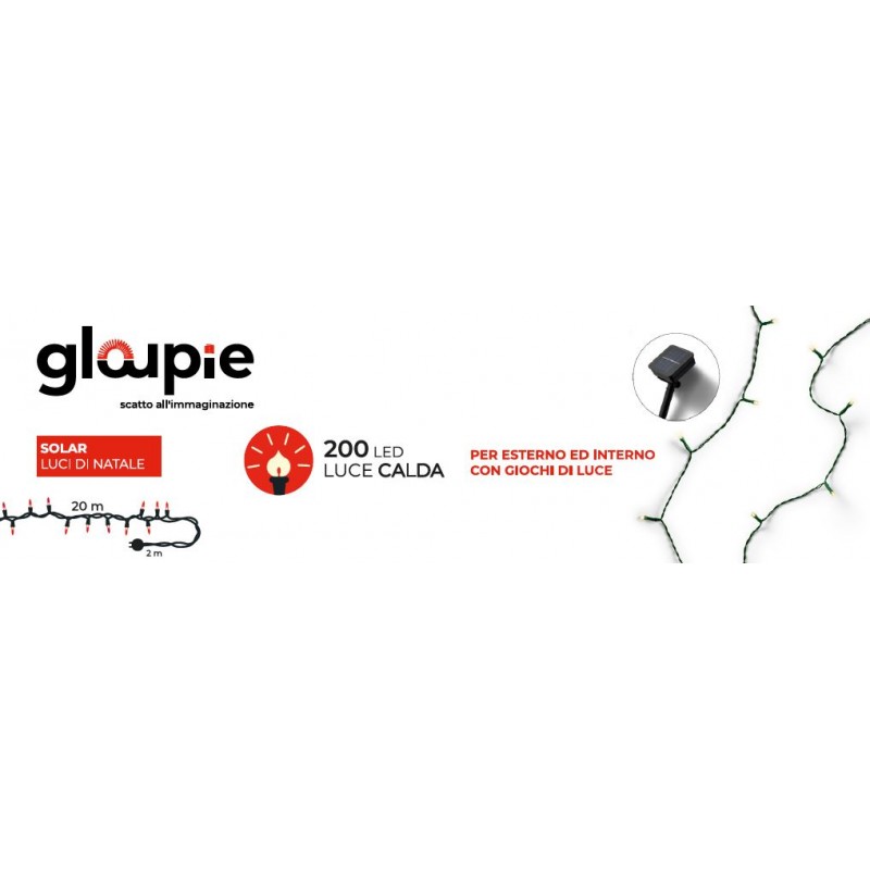 Avvolgi La Tua Casa In Un'Atmosfera Incantevole Con Le Luci Gloupie. La Loro Calda Luce Dorata, Diffusa Da 200 Led Suddivisi Su Di Un Cavo Verde Lungo 22 Metri (20 Metri Di Luci Con Distanza Fra Loro Di 10 Cm e 2 Metri Di Solo Cavo Per Un Migliore Collegamento Al Pannello Solare), Creerà Un'Atmosfera Festosa E Accogliente. Ideali Sia Su Alberi Di Natale, Balconi, Facciate, O Qualsivoglia Spazio E Oggetto Interno O Esterno