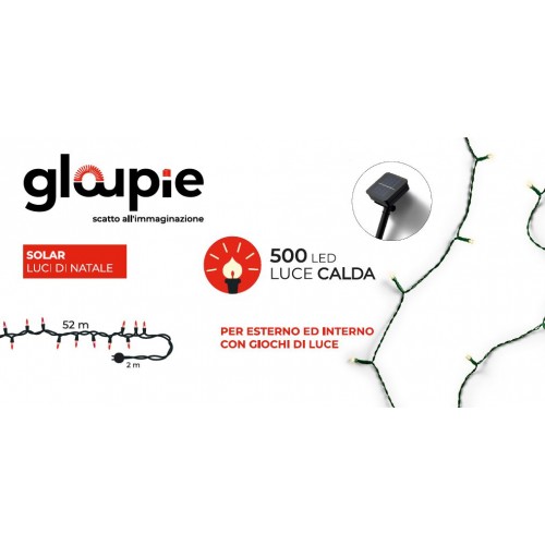 - Gloupie Luci Di Natale Solar da 52 mt con 500 Led Bianco Caldo, Cavo Verde, Funzione Memoria e Timer