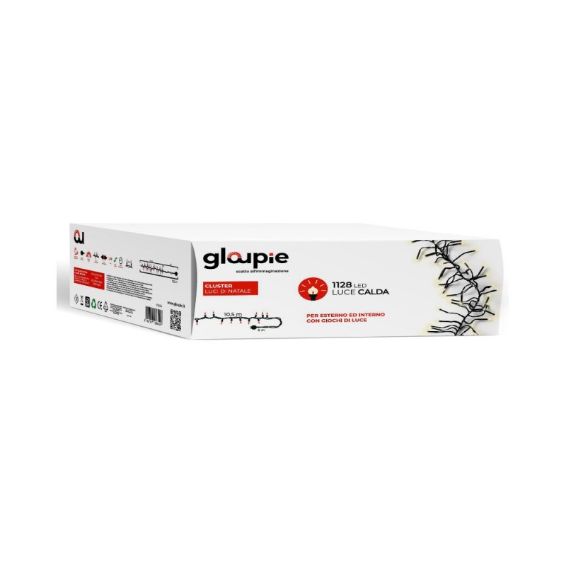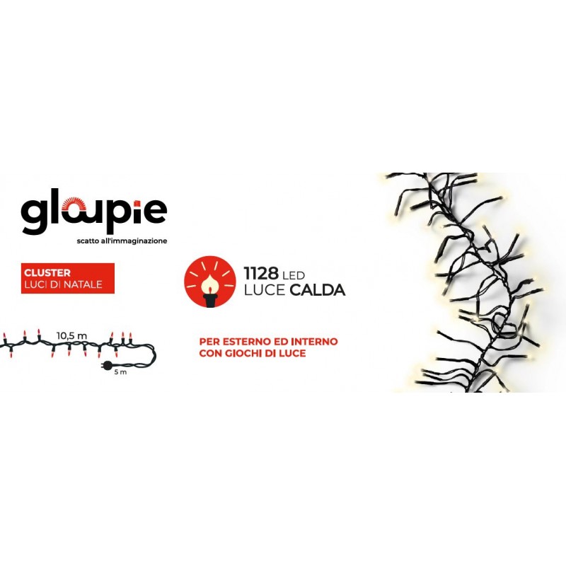 Avvolgi La Tua Casa In Un'Atmosfera Incantevole Con Le Luci Gloupie Cluster. La Loro Calda Luce Dorata, Diffusa Da 1128 Led Suddivisi Su Di Un Cavo Verde Lungo 15,5 Metri (10,5 Metri Di Luci Con Distanza Fra Loro Di 0,9 Cm e 5 Metri Di Solo Cavo Per Un Migliore Collegamento Alla Presa Domestica), Creerà Un'Atmosfera Festosa E Accogliente. Ideali Sia Su Alberi Di Natale, Balconi, Facciate, O Qualsivoglia Spazio E Oggetto Interno O Esterno