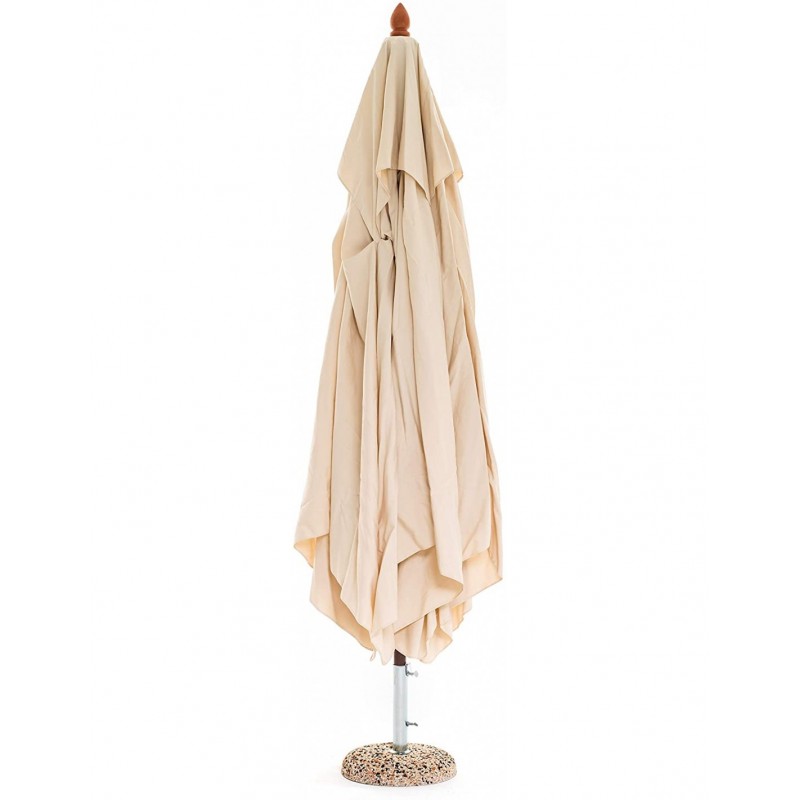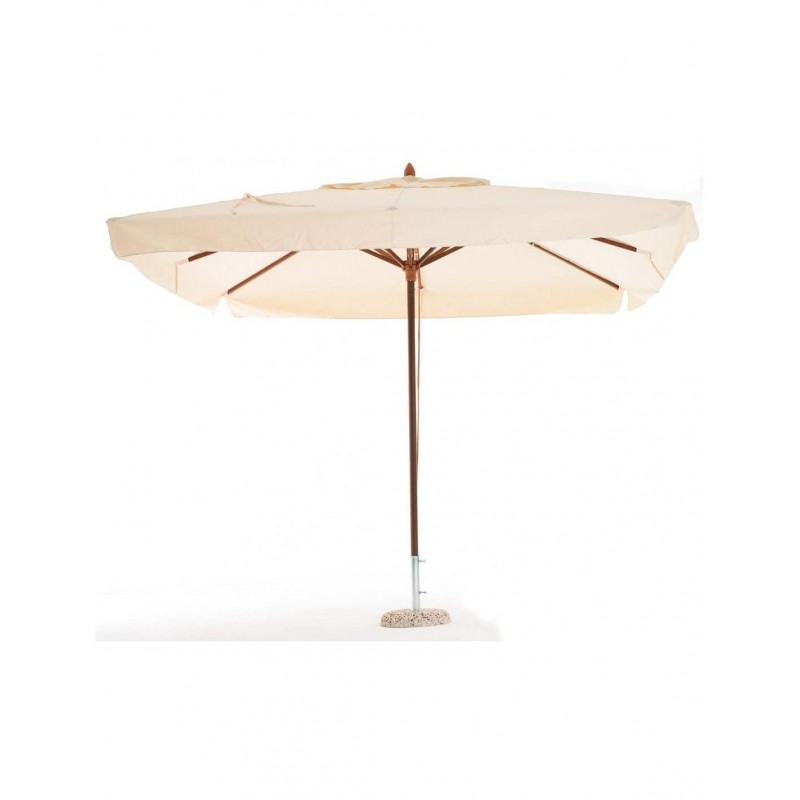L'ombrellone Oasis presenta una struttura realizzata in legno con finitura tinta olio ed e' dotato di un telo in poliestere traspirante e idrorepellente, rifinito con volant laterali. Il camino antivento garantisce stabilita' in caso di forte vento.