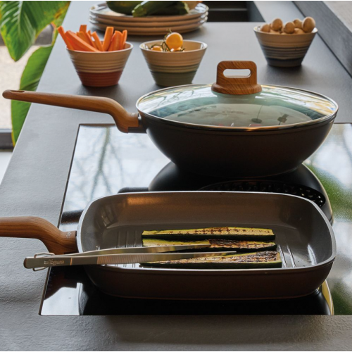 Calore uniforme, cottura impeccabile. Il fondo ad alto spessore garantisce una distribuzione omogenea del calore, mentre il manico con finitura soft touch effetto legno assicura una presa antiscivolo e fresca.