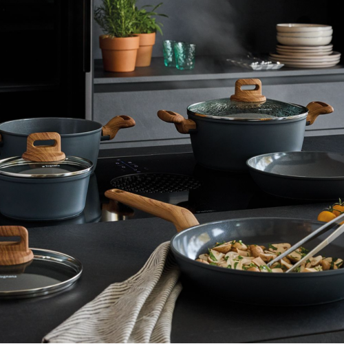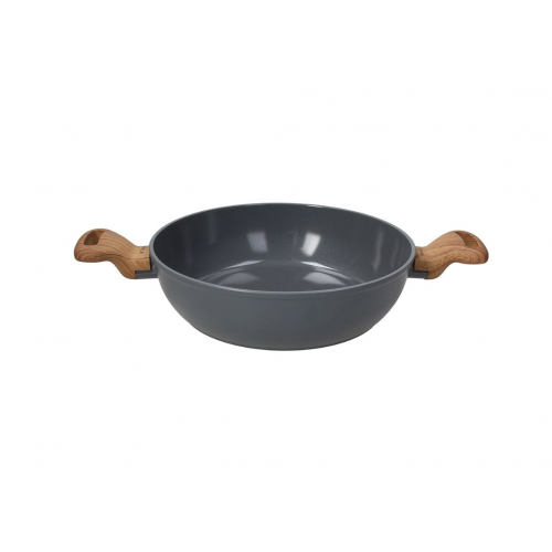 Calore uniforme, cottura impeccabile. Il fondo ad alto spessore garantisce una distribuzione omogenea del calore, mentre il manico con finitura soft touch effetto legno assicura una presa antiscivolo e fresca.