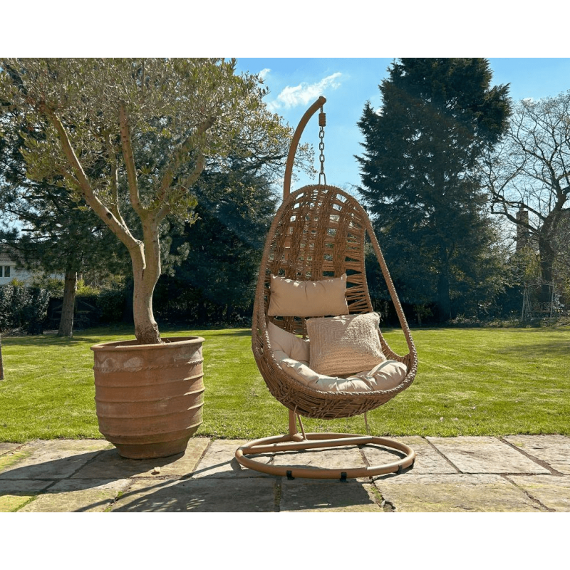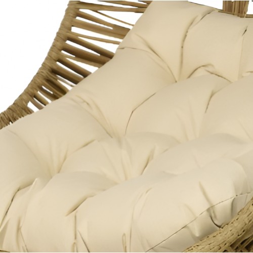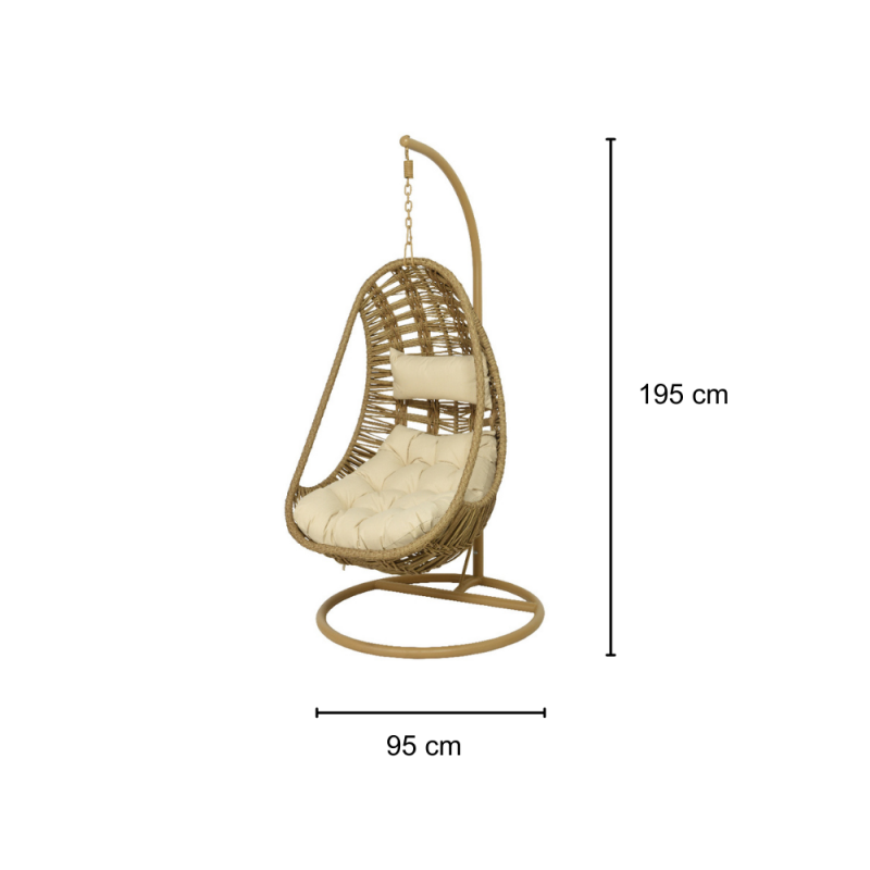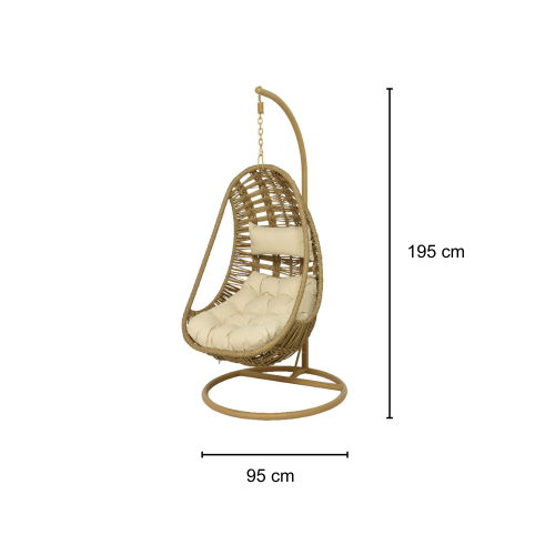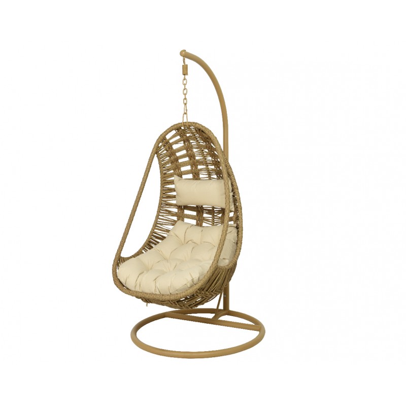 [Qualita' certificata]: Klulk poltrona amaca a dondolo sospesa da esterno per giardini, terrazze, patios, balconate linea paros con struttura in acciaio tubolare beige verniciato a polvere epossidica e guscio in poli-vimini resistente ai raggi uv, diametro 95 cm x altezza 195 cm, completa di seduta e poggiatesta imbottito in poliestere beige, portata massima 120 kg