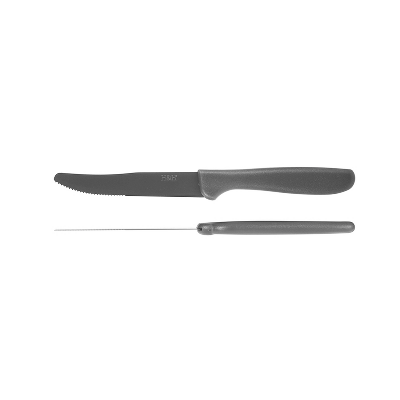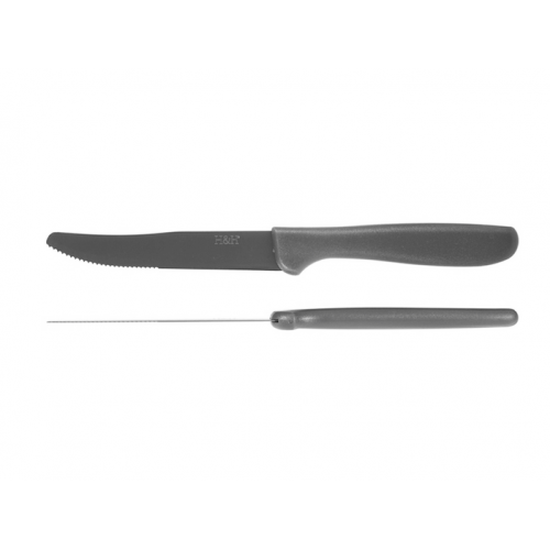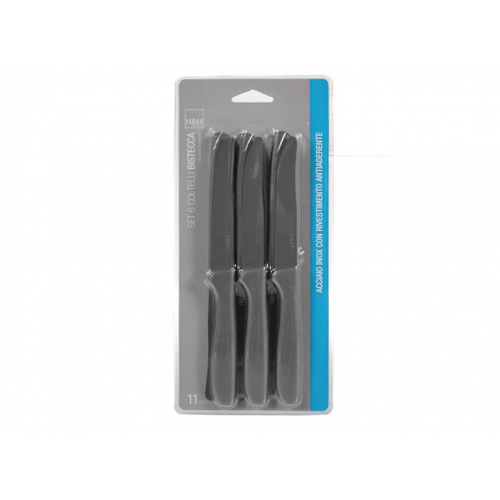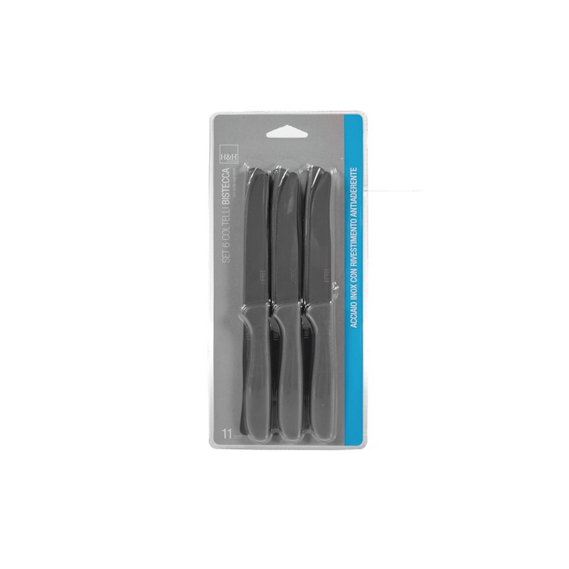 Confezione 6 coltelli lama in acciaio con rivestimento antiaderente, punta tonda mezza seghetta, colore grigio.