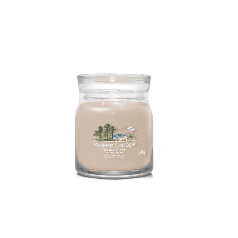 Yankee Candle Candela Giara Media Signature Seaside Woods, Lasciati avvolgere in un''atmosfera intrigante: note che richiamano il legno trasportato dalle onde si combinano ad un accordo brillante ispirato ad agrumi e note floreali, per una perfetta vacanza sulla costa.