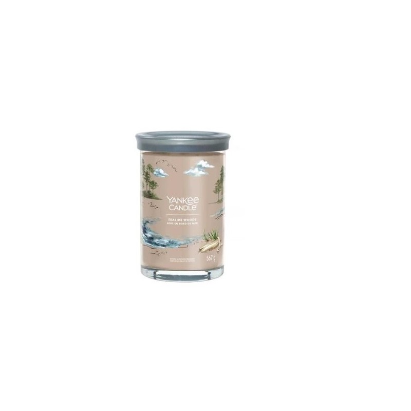 Yankee Candle Candela Tumbler Grande Signature Seaside Woods, Lasciati avvolgere in un''atmosfera intrigante: note che richiamano il legno trasportato dalle onde si combinano ad un accordo brillante ispirato ad agrumi e note floreali, per una perfetta vacanza sulla costa.
