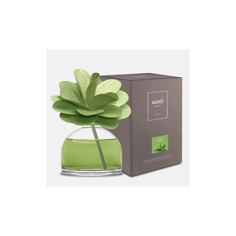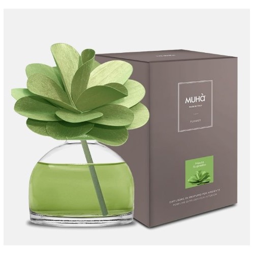rofumatore d'ambiente in bottiglia di vetro con diffusore a forma di fiore in legno di betulla realizzato a mano. MOSTO SUPREMO La fragranza seducente che cattura econfonde tutti i sensi. Profumo irresistibile che si dischiude con un delicato movimento profondo, donato dall’intensa nota di uva fragola e dalla delicata sfumatura di vaniglia