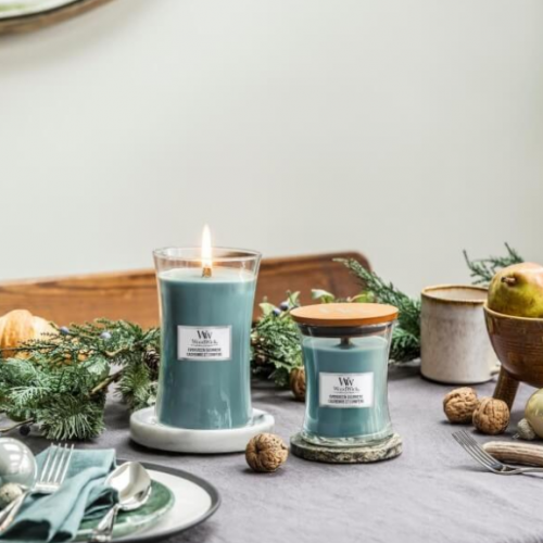 Vetro: I formati ellittici presentano un’apertura più ampia per una pozza di cera completamente fusa, che produce una fragranza più intensa e consistente. Include un coperchio in legno