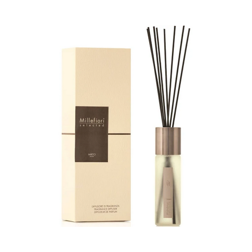 Il diffusore a bastoncini selected 100ml Mirto di Millefiori ricorda aromi freschi di agrumi, amalgamati a note aromatiche e dolci di ambra e ginepro, ravvivate dall'intenso sentore di resina, dato dal lentisco.