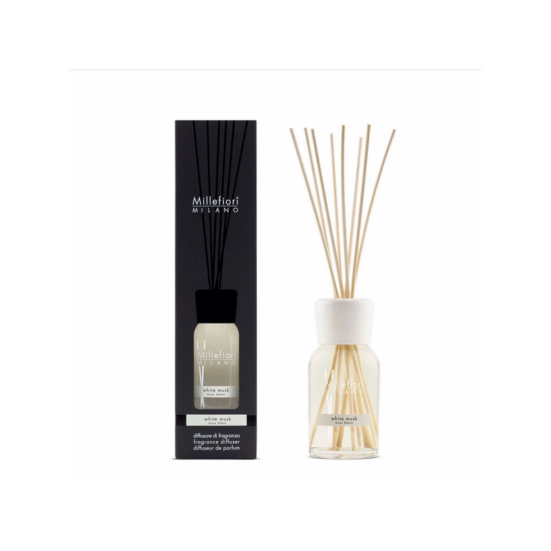 Diffusore Stick Natural White Musk Millefiori 250ml Diffusori a bastoncino Una soluzione che si integra con stile e discrezione in ogni ambiente regalando una profumazione delicata e duratura. La fragranza viene profusa attraverso i bastoncini che, immersi nel liquido, la assorbono e la rilasciano verso l’alto in modo costante.
