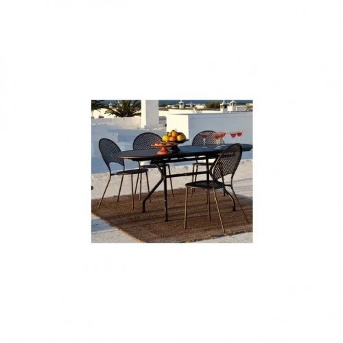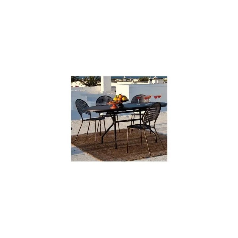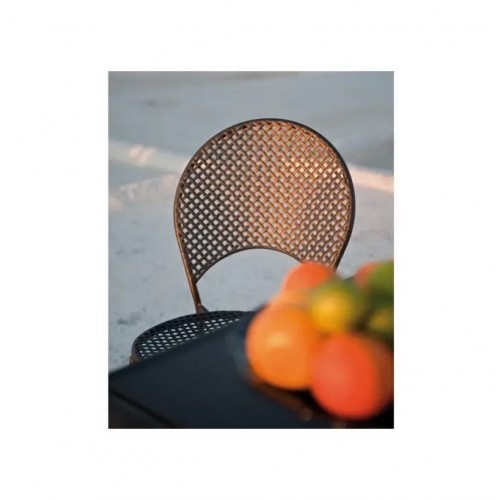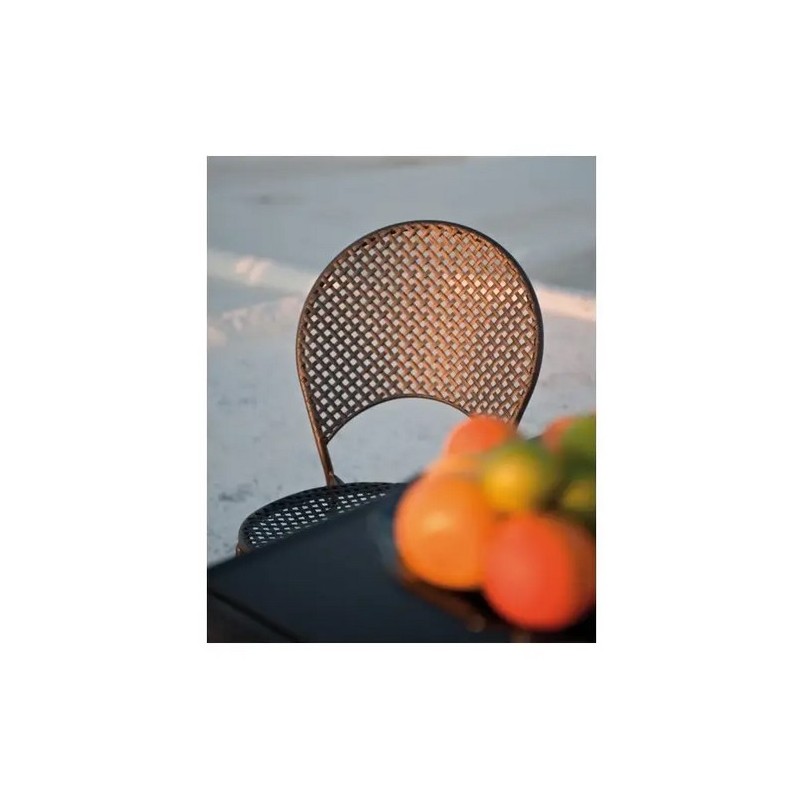 Il traforo a maglie larghe della lamiera disegna su sedili e schienali il motivo caratterizzante la serie. Cuscini imbottiti invitano al relax intorno a un tavolo, nella terrazza di casa o nello spazio all’aperto di bar su vie e piazze fascinose.