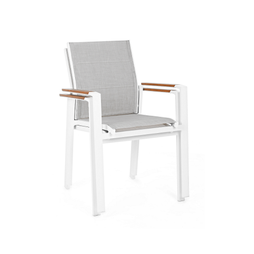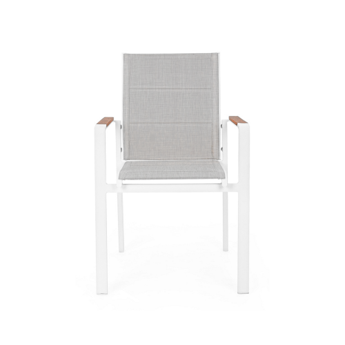[Qualita' certificata]: Klulk poltrona da giardino polignano con braccioli dotati di inserti in polywood color teak, struttura realizzata in alluminio verniciato a polvere epossidica resistente ai raggi uv e alle intemperie, impilabile, lunghezza 56 cm x profondità 65 cm x altezza 87 cm, seduta confortevole in textilene morbido e anti ingiallimento per arredo esterno, terrazze, piscina, patios e balconate