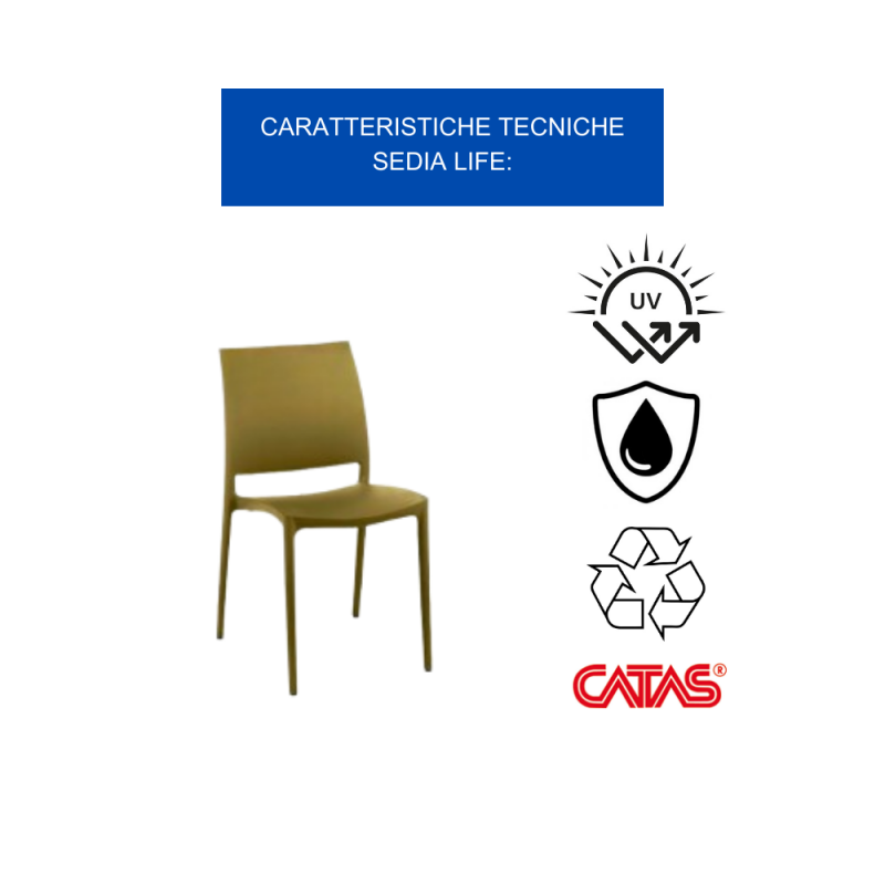 [Sicurezza e affidabilita']: La sedia life è un prodotto sicuro e affidabile, realizzato con materiali di alta qualità e testato per garantirne la resistenza e la stabilità. La struttura robusta è in grado di sopportare un peso fino a 120 kg, mentre i piedini fermi e saldi assicurano una perfetta aderenza al suolo, prevenendo cadute e ribaltamenti. Lo spazio vuoto sul fondo dello schienale facilita la presa e il trasporto, rendendola ancora più pratica da utilizzare