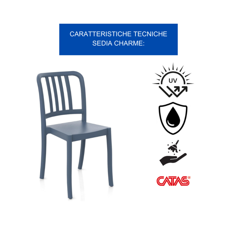 [Sicurezza e affidabilita']: La sedia charme è un prodotto sicuro e affidabile, realizzato con materiali di alta qualità e testato per garantirne la resistenza e la stabilità. La struttura robusta è in grado di sopportare un peso fino a 120 kg, mentre i piedini fermi e saldi assicurano una perfetta aderenza al suolo, prevenendo cadute e ribaltamenti. Gli spazi vuoti del motivo dello schienale facilita la presa e il trasporto, rendendola ancora più pratica da utilizzare