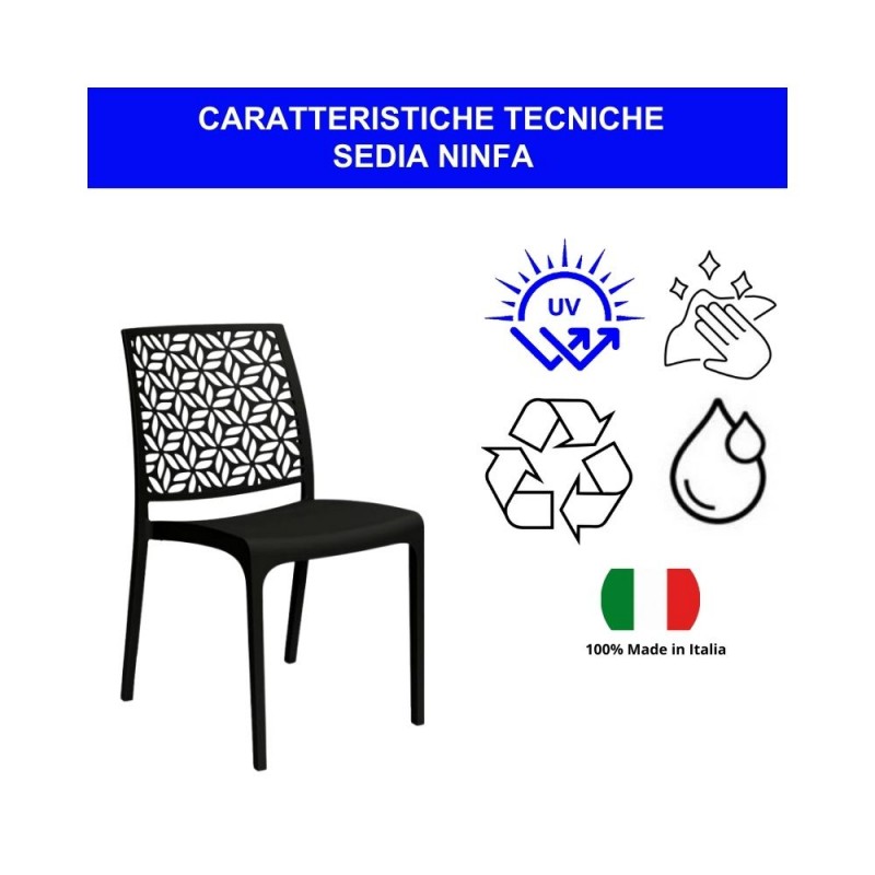 [DESIGN VERSATILE E FUNZIONALE]: La sedia Ninfa, elegante e raffinata, si distingue per lo schienale lavorato a forma di ninfee, un dettaglio ispirato alla natura che ne esalta il carattere e la bellezza senza tempo. Perfetta per spazi moderni e sofisticati, unisce tradizione e design contemporaneo. Adatta sia per esterni che interni, è compatta e impilabile, rendendola pratica oltre che elegante. Ideale per giardini, ristoranti o ambienti domestici, Ninfa dona a ogni spazio un tocco di classe e comfort.