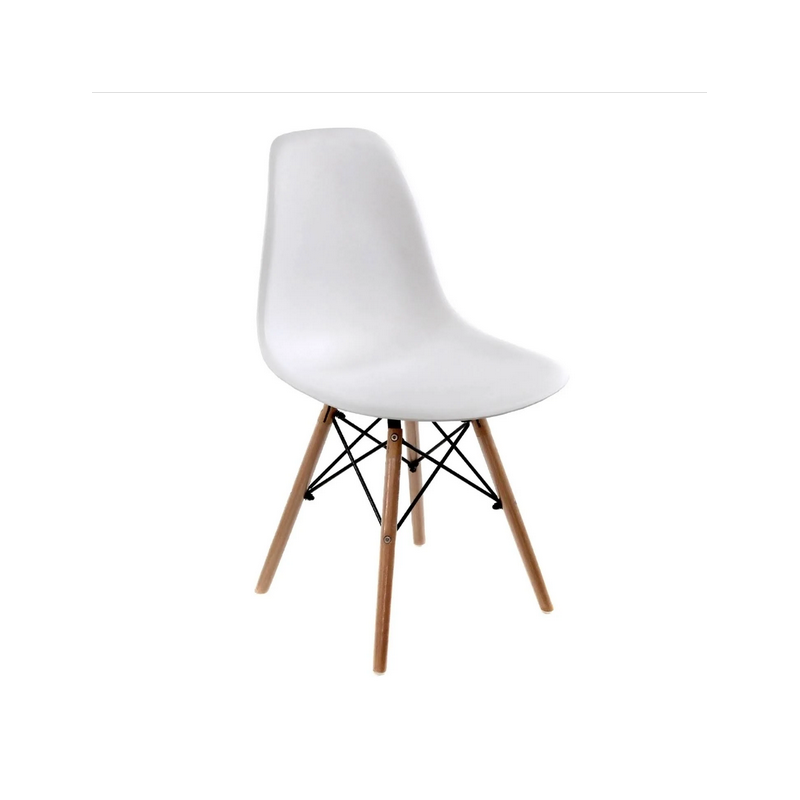 Schienale e seduta sono realizzati in solida plastica bianca con finitura opaca e le gambe in legno sono robuste e provviste di tacchetti antiscivolo, per supportare un peso massimo di 150 kg.