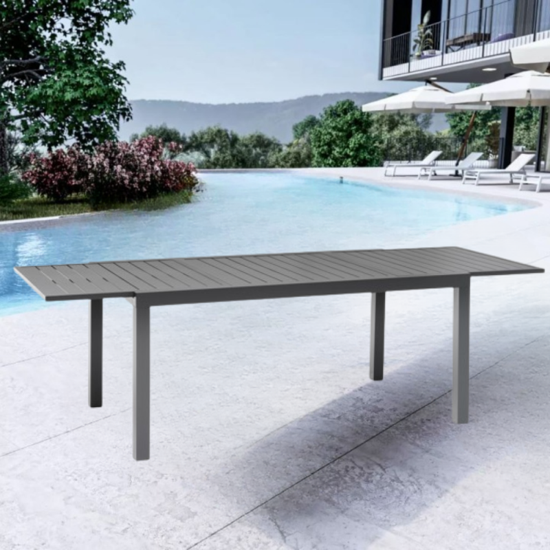 [Qualita' certificata]: Gloupie tavolo allungabile da giardino per 10 persone alamos con struttura in alluminio verniciato a polvere epossidica resistente ai raggi uv e alle intemperie, lunghezza variabile da 200 a 300 cm x profondità 90 cm x altezza 75 cm, dotato di prolunga estraibile con sistema a scomparsa e piano a doghe sempre in alluminio