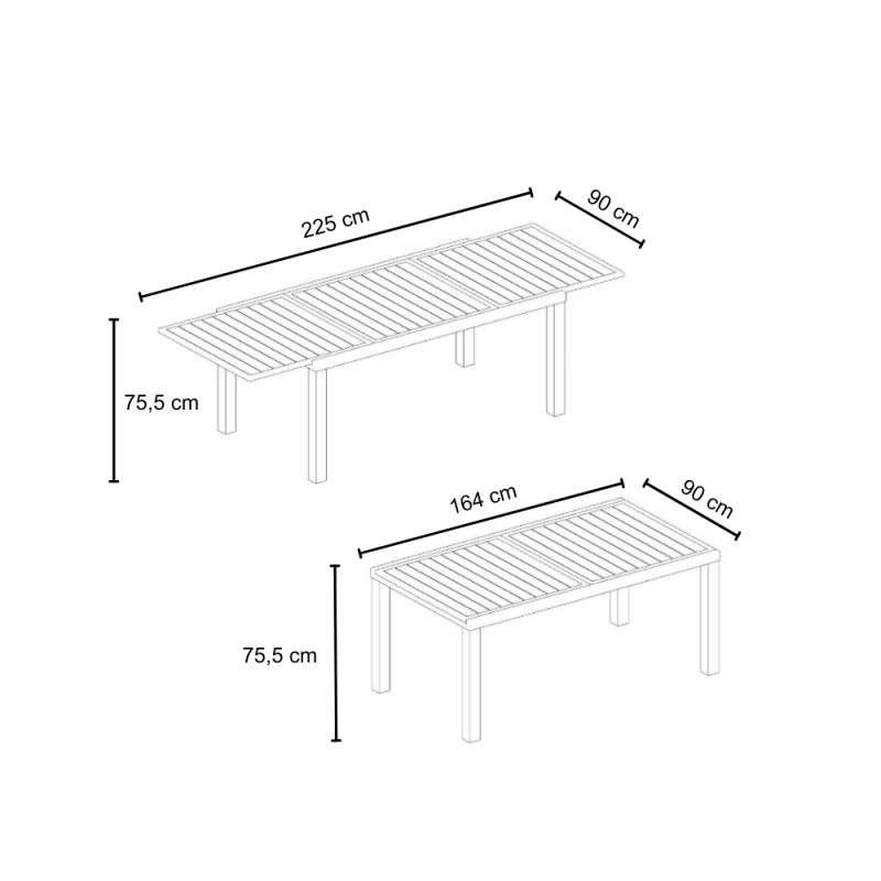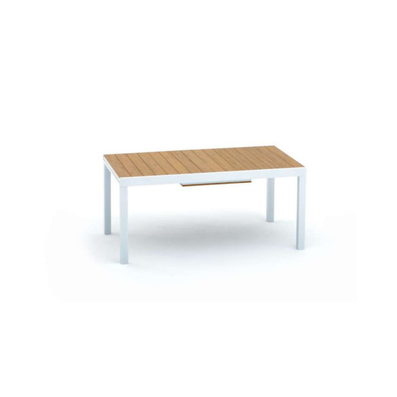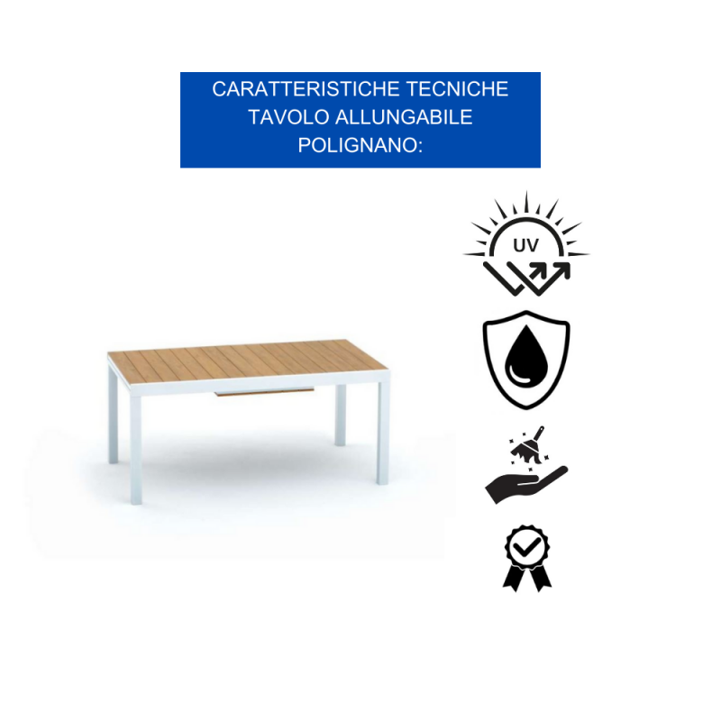 [Qualita' certificata]: Klulk tavolo allungabile da giardino polignano con struttura in alluminio verniciato a polvere epossidica resistente ai raggi uv e alle intemperie, lunghezza variabile da 164 a 225 cm x profondità 90 cm x altezza 75,5 cm, dotato di prolunga estraibile con sistema a scorrimento e piano a doghe in polywood dalla colorazione teak