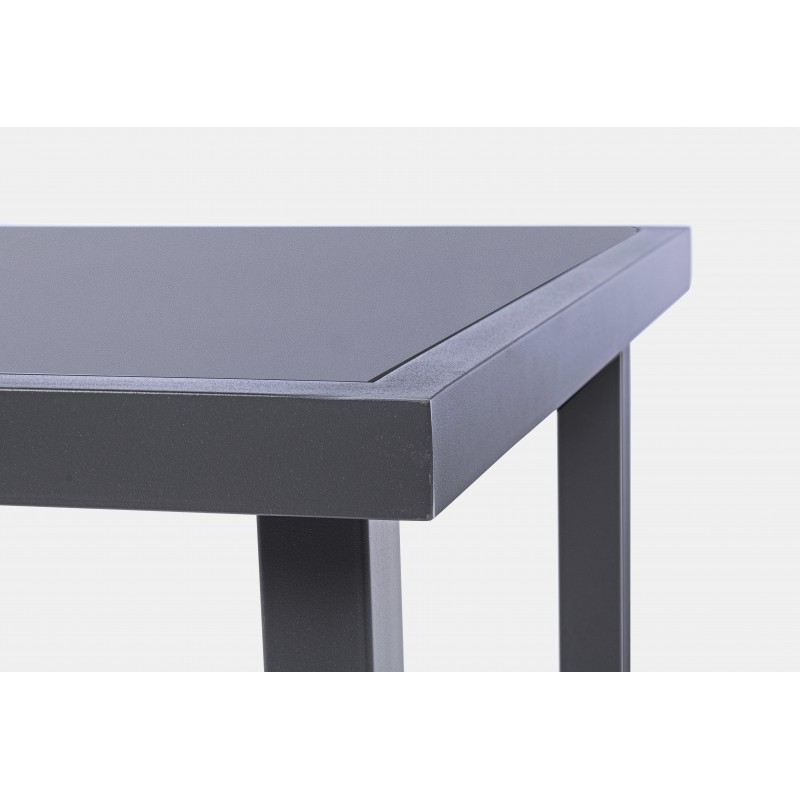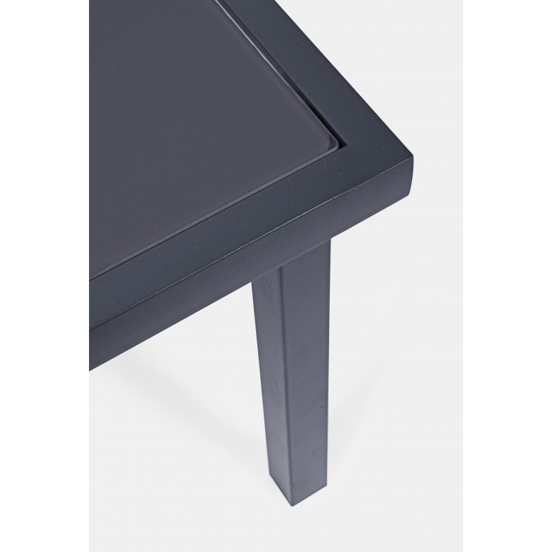 la struttura del tavolino è in acciaio verniciato color antracite con piano in vetro trasparente.