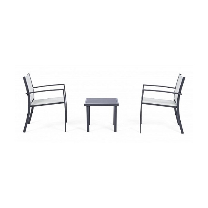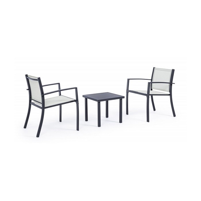 un set comodo, grazie alla seduta in textilene delle sedie e funzionale, grazie al pratico tavolino perfetto per appoggiare qualsiasi cosa, ideale per gustare deliziosi aperitivi in compagnia di amici e parenti nel proprio spazio outdoor.