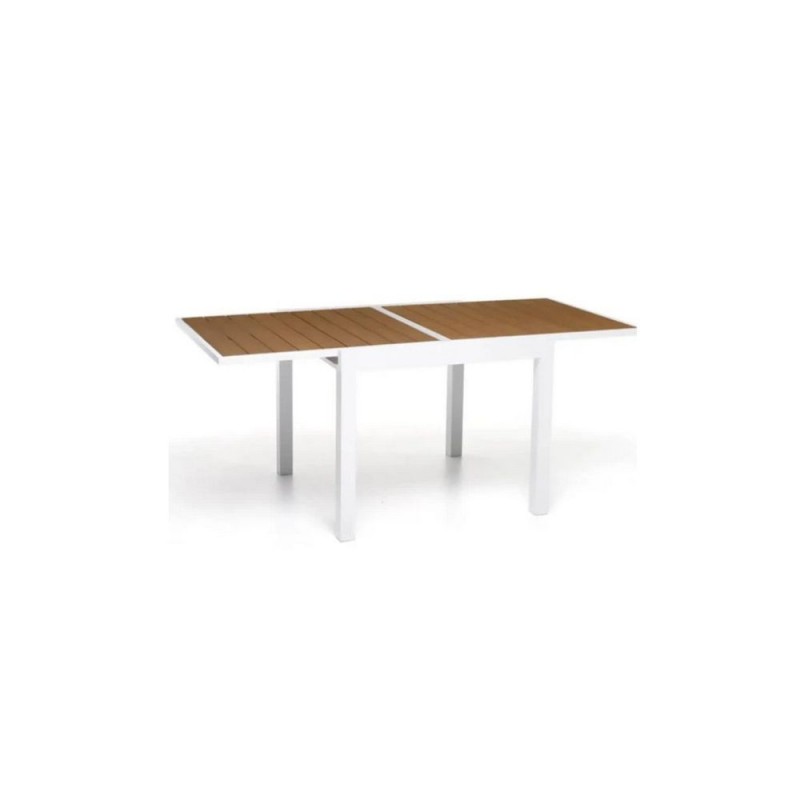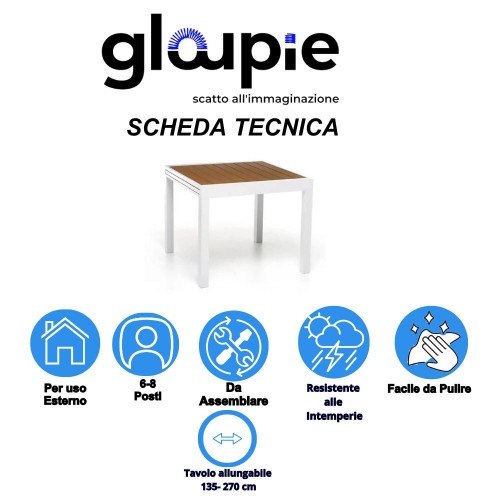 Gloupie Tavolo Allungabile Da Giardino Per 6 Persone Santa Fe Con Struttura In Alluminio Verniciato A Polvere Epossidica Di Colore Bianco Resistente Ai Raggi UV E Alle Intemperie, Lunghezza Variabile Da 90 A 180 Cm X Profondità 90 Cm X Altezza 75 Cm, Dotato Di Prolunga Estraibile Con Sistema A Scorrimento E Piano A Doghe In Polywood Dalla Colorazione Teak