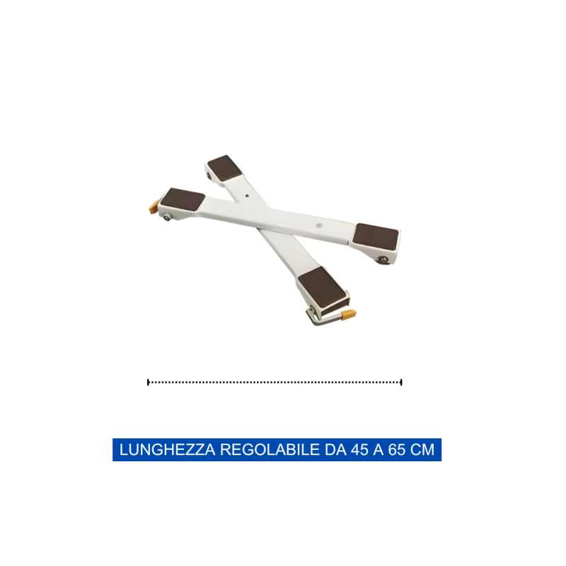 [Qualita' certificata]: Gloupie base sposta elettrodomestici e mobili composta da coppia di carrelli regolabili in lunghezza da 45 a 65 cm, in acciaio laccato bianco con terminali in gomma antiscivolo, completa di ruote e freno in polipropilene da 1", portata massima 80 kg