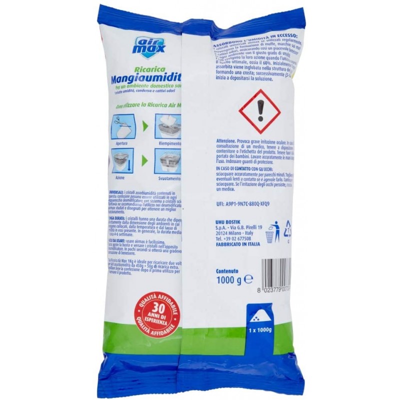 - il formato da 1kg permette di ricaricare più volte il kit assorbiumidità sali 450g