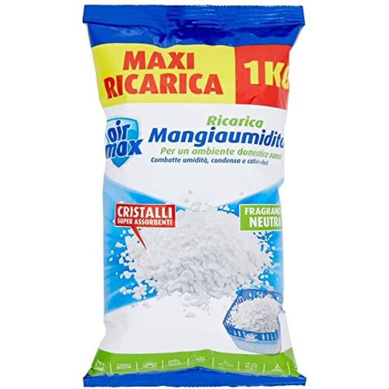 le ricariche air max sali per kit assorbiumidità assorbono humidity in eccesso, contrastano il formarsi di muffe e di macchie sui muri e combattono i cattivi odori. la chiusura "apri e chiudi" permette la conservazione del prodotto. il formato da 1kg permette di ricaricare più volte un kit sali assorbiumidità air max da 450gr. disponibile in diverse fragranze.
